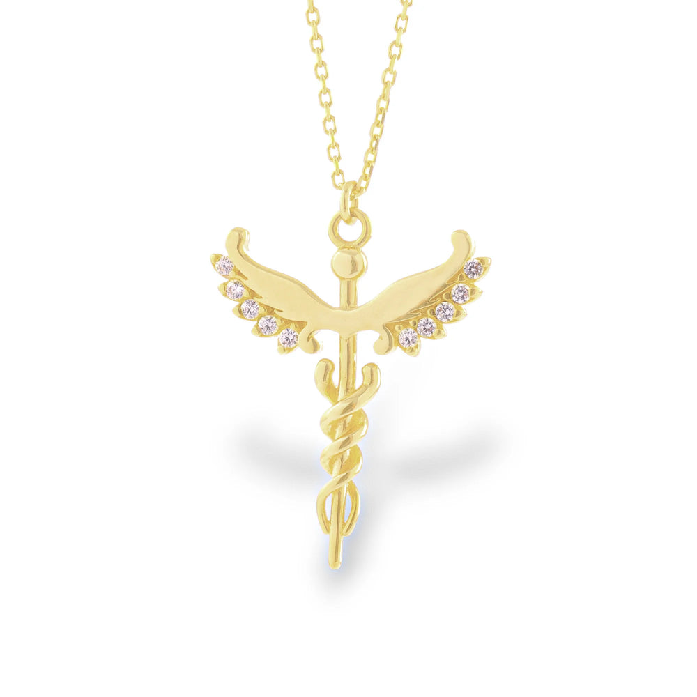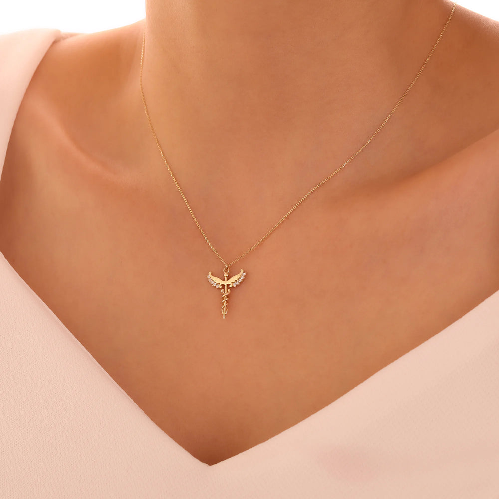 A meaningful design that elegantly brings the caduceus's symbol of healing and balance to your neck with a delicate line.