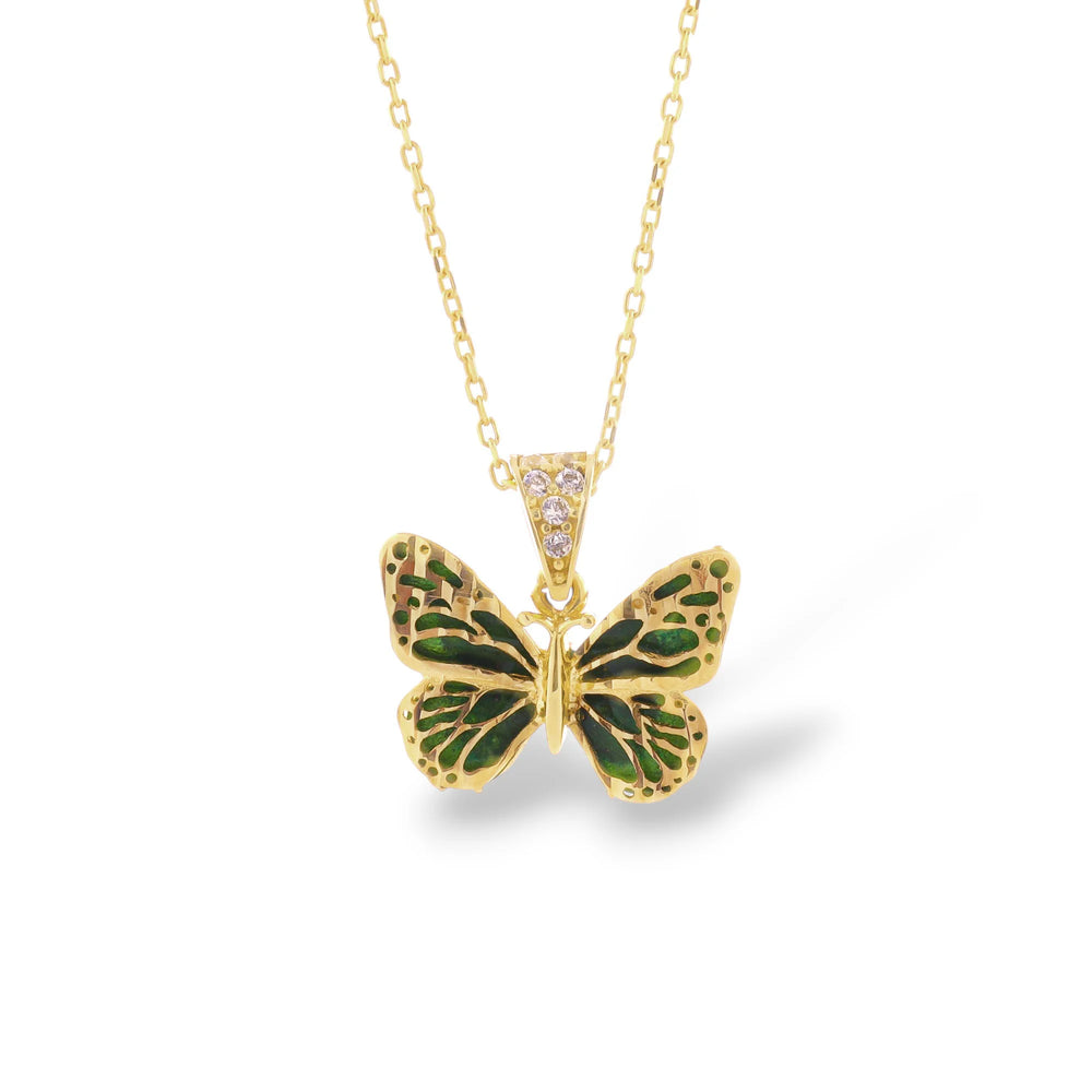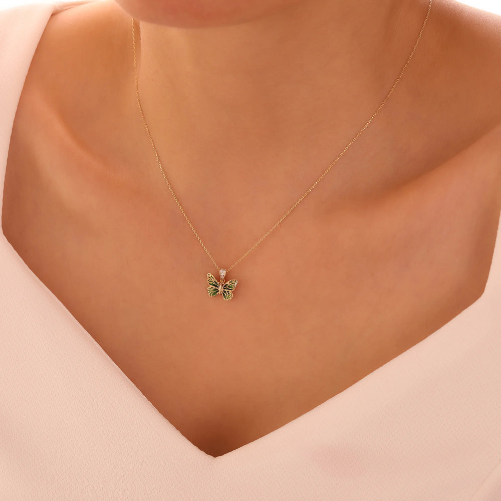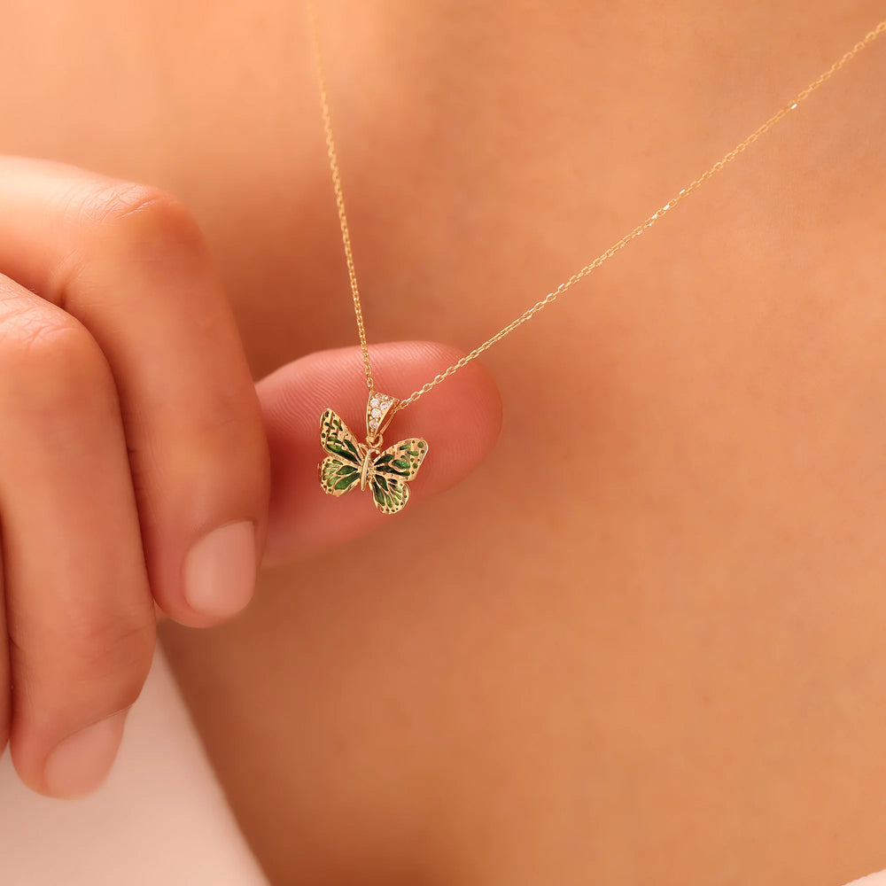 Yeşil kelebeğin taze enerjisini ve zarif ışıltısını boynunuza taşıyan canlı ve naif bir tasarım.